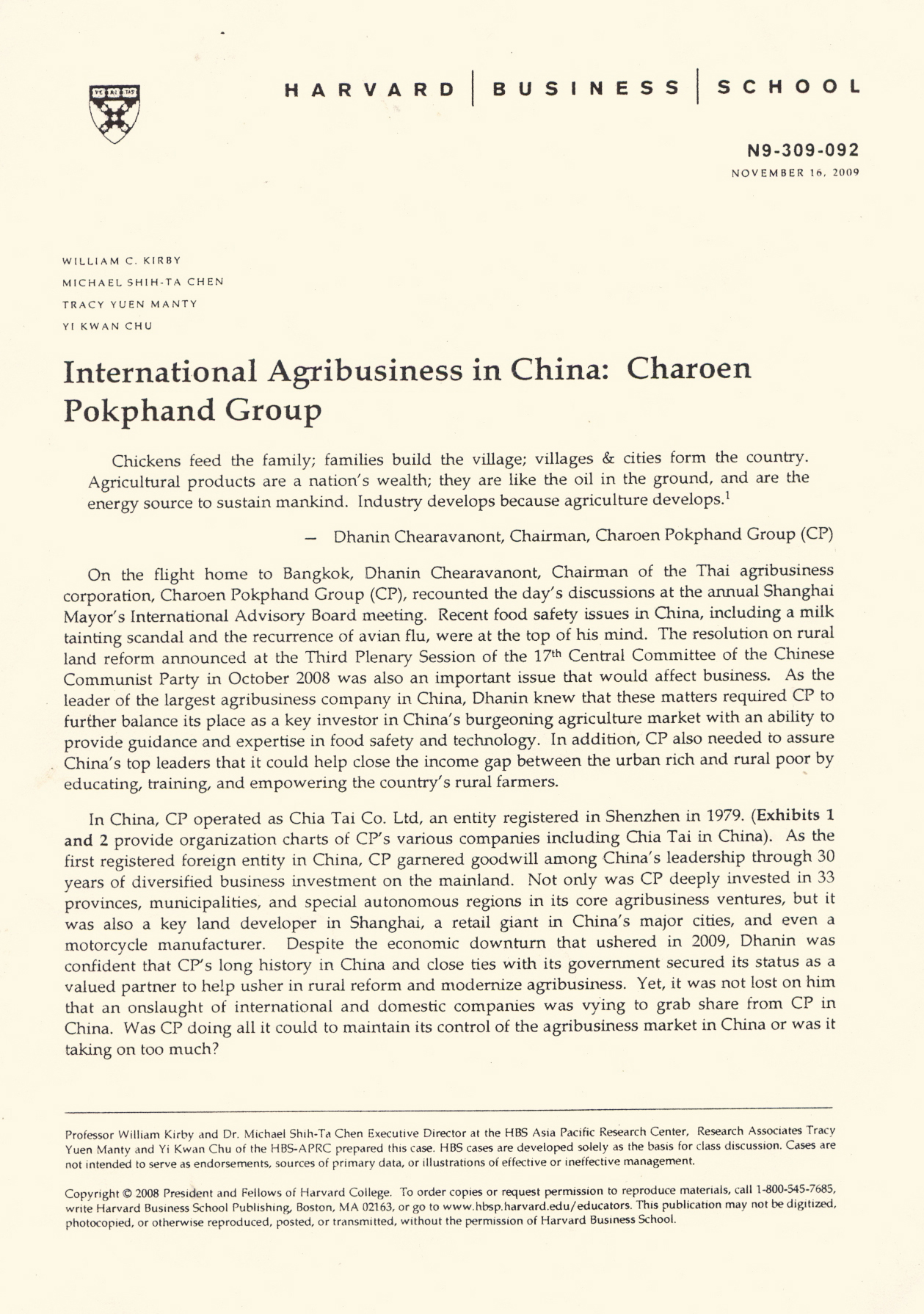 Harvard Business School ได้ศึกษาธุรกิจของซีพี และเขียนเรื่องราวเป็นกรณีศึกษาไว้ เนื้อหาจากนี้ไปก็คือ ข้อความที่เรียบเรียงบางส่วนมาจากเอกสารกรณีศึกษาซีพี ซึ่งมีขึ้นในราวปี 2535 ถือเป็นยุคข้อต่อของการเปลี่ยนแปลงซีพีได้อย่างดี เอกสารชิ้นนี้มีขึ้นเมื่อวันที่ 30 พฤศจิกายน 2535