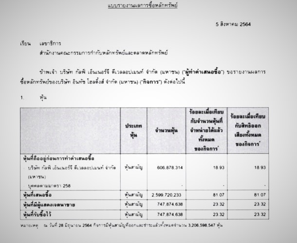 -5 สิงหาคม 2564 สามารถถือหุ้นใหญ่ INTUCH ได้ถึง 42.25%